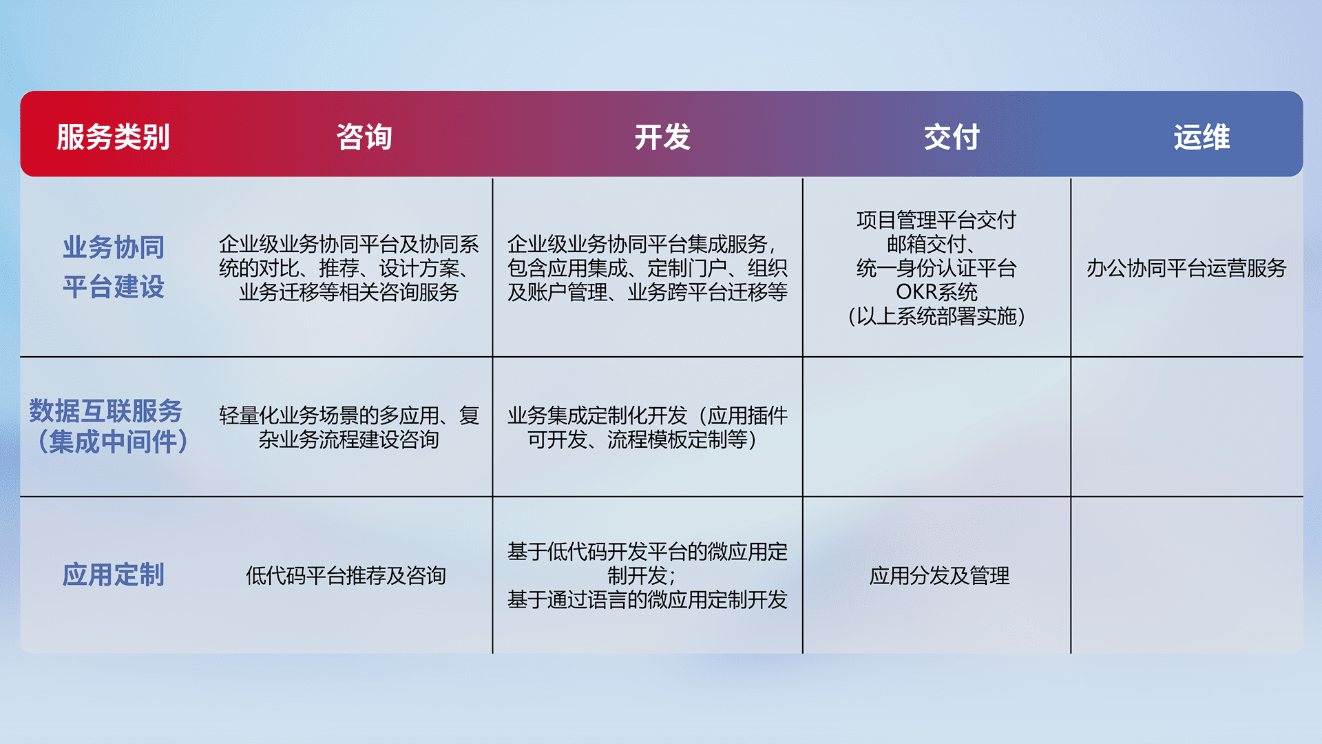 针对钉钉、、、企微、、、、IDaas等平台级产品提供产品的规划、、方案、、、交付、、、、定制化开发等服务,,,,实现如统一协同办公、、智能客户服务、、、、混合会议管理、、智能数据查询、、、、等业务场景,,,实现数字化转型。。